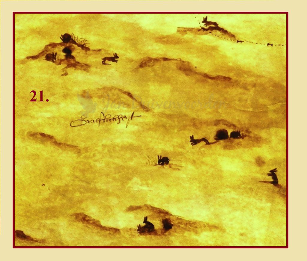 21. Bij de konijnen af. Dat onze voorouders ook over humor beschikten laat kaartmaker Sijmon Aerntszoon mooi zien, hij tekent naast een jagende vos in het duin van de “Graaffelijkheid” (Domeinen van Holland) ook vele konijntjes die ondere andere bezig zijn met een activiteit waar konijntjes hun reputatie aan danken…..