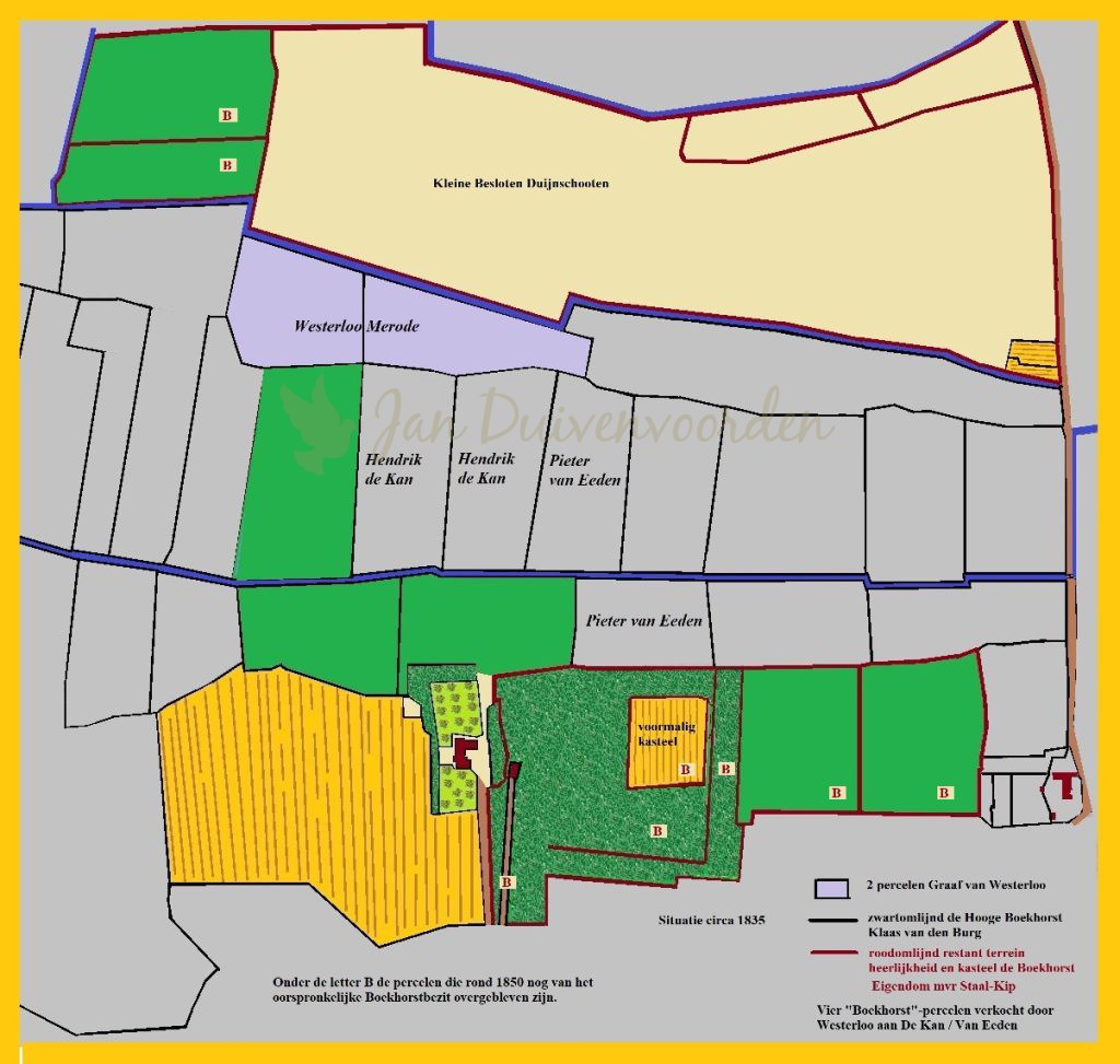 Aan de lange historie van heerlijkheid de Hooge Boekhorst komt in 1834 min of meer een einde. Min of meer want het heerlijkheidsrecht blijft bestaan maar voor het eerst in haar geschiedenis wordt een Noordwijkerhoutse boer eigenaar van een groot deel van het oorspronkelijke Boekhorstterrein. Klaas van den Burg koopt voor 3230 gulden het boerengebouw de Hooge Boekhorst met erven, boomgaarden, bospartijen, weiland en een grote akker, in totaal ruim 13 hectare. Op één weiland na ligt zijn nieuwe bezit geheel ten oosten van de Woensdagse Wetering en ten zuiden van de laan naar de poort van het oorspronkelijke kasteel. Aan de andere kant van die laan blijft circa 9 hectare eigendom van de toenmalige eigenaresse van de heerlijkheid, de weduwe Staal-Kip. Zij bezit ook nog landerijen ten westen van de Woensdagse Wetering, maar die behoorden slechts gedeeltelijk tot de oorspronkelijke heerlijkheidsgoederen van de Boekhorst zoals we die kennen van kaarten uit de late 16e eeuw.