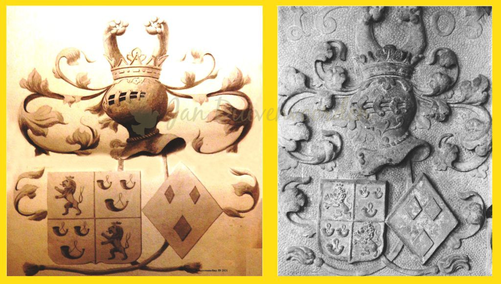 Het familiewapen dat in de poort van het kasteel was gemetseld geeft ons de wapenschilden van Andries van Bronckhorst (links: leeuwen en posthoorns) en Anna van Woerden van Vliet (rechts, de drie ruiten).
