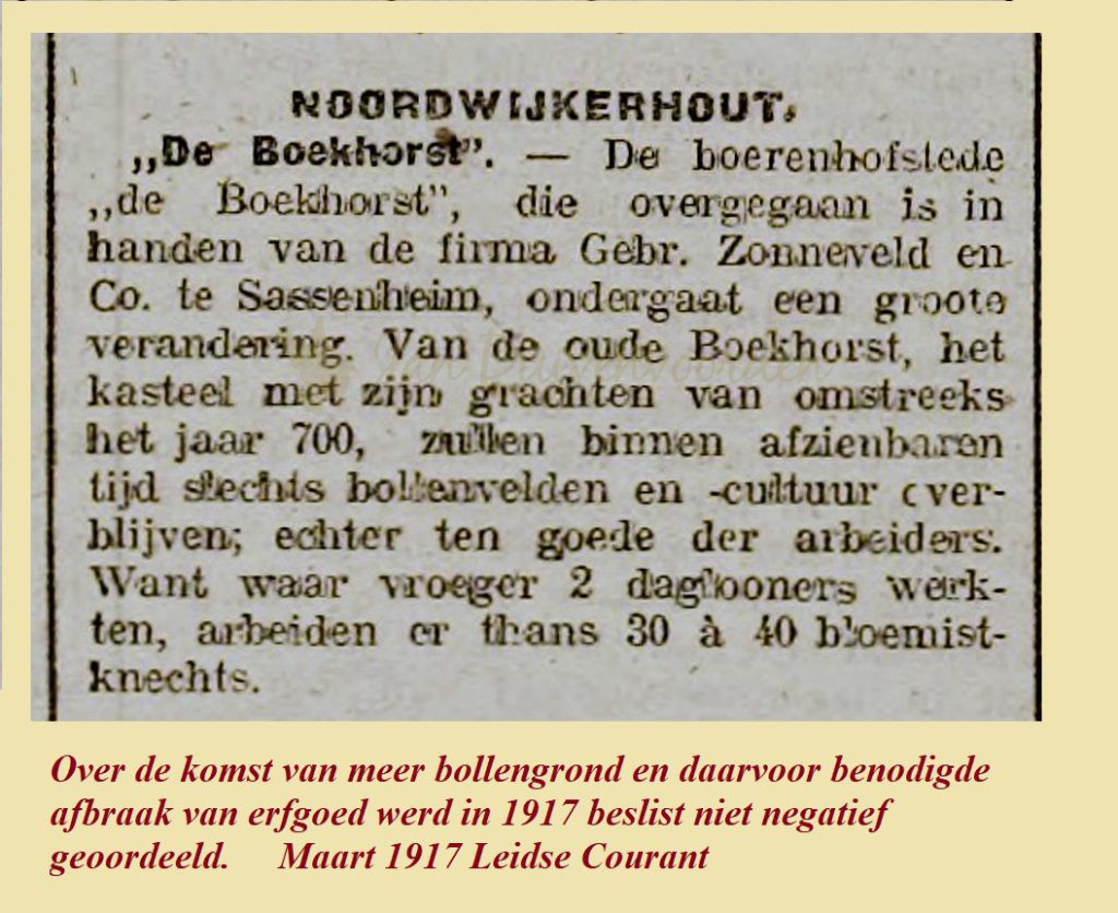 De komst van de bollenteelt naar Noordwijkerhout heeft forse gevolgen voor het eeuwenoude kasteelterrein. Daar was door de notaris Petrus Lau nog een woning gebouwd of aangekocht bij de alleroudsten onder ons nog bekend als de woning van Job Pennings. Begin 20e eeuw kopen de broers Johannes en Hendrik Zonneveld en Jan Peereboom, deelnemers in de firma Zonneveld&Co een groot deel van het terrein op en vervolgens ook boerderij de Hooge Boekhorst met bijna 15 hectare weiland. De eeuwenoude boerderij was door de familie Van den Burg kort daarvoor nog overgedragen aan Jan Huibertszoon Duivenvoorden uit het Langeveld. Het hele gebied dat bij elkaar meer dan 30 hectare groot was wordt door Zonneveld&Co. afgezand waarbij het terrein flink lager komt te liggen. Dit is nu nog goed te zien aan het verschil in hoogte ten opzichte van de Langevelderweg. Restanten van het kasteel die bij de afzanding zijn aangetroffen werden verwijderd, althans voor zover noodzakelijk was om de grond in cultuur te kunnen brengen.