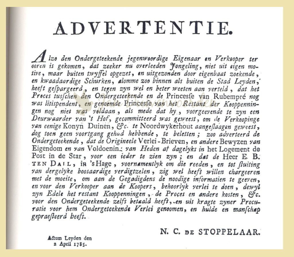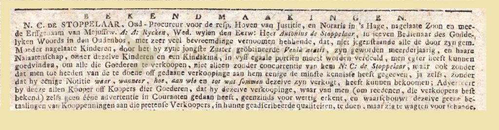 De advertentie kenmerkt de persoon van Nicolaas de Stoppelaar in deze fase van zijn leven. Zouden we over zijn jongere jaren nog kunnen spreken van een overdreven rechtlijnig denkend en handelend persoon nu lijken zijn stoppen doorgeslagen te zijn. Dat hij onder dezelfde advertentie nog een tweede plaatst om verhuur van het Rechthuis van de Laage Boekhorst aan te kondigen maakt het bizar. Zou hij nu echt gedacht hebben dat hij huurders aan kon trekken na in de advertentie erboven te hebben laten zien hoe rancuneus hij kon zijn ten opzichte van dierbaren? Kort hierop, in de winter van 1783 reageert hij op vergelijkbare wijze naar de vertegenwoordiger van de prinses de Rubempré, die moedwillig in de krant had aangekondigd dat de Boekhorst verkocht zou gaan worden. De reactie van Nicolaas in de krant is die van een straatvechter, hard en gemeen. Hij brengt de man voor het gerecht omdat sprake was van een voorbarige en onterechte aankondiging van de verkoop, waarvoor de man dan ook bestraft zal worden.