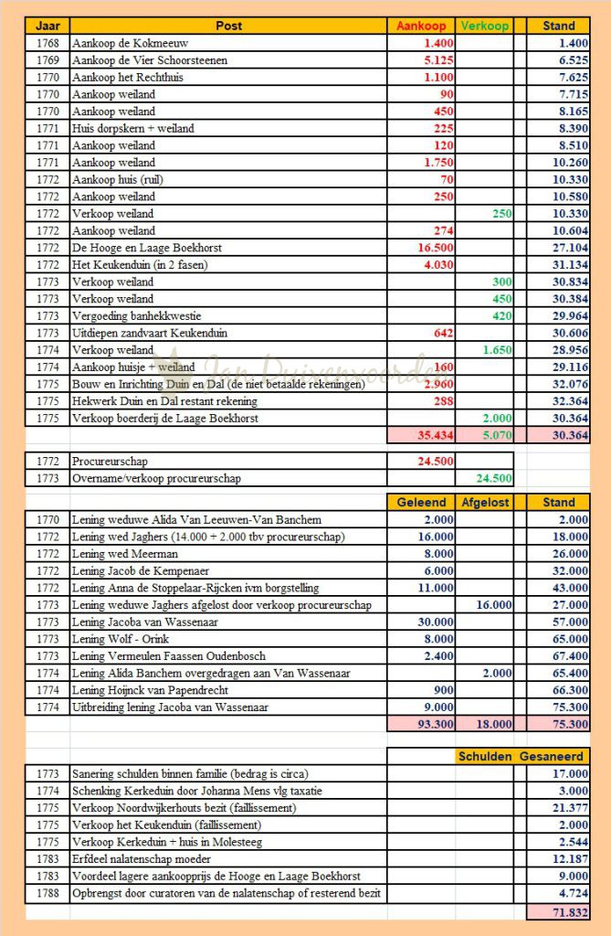 Die schulden zijn hieronder nog eens op een rijtje gezet in een financieel overzicht. Weergegeven op chronologische volgorde per onderdeel: aan- en verkoop van onroerend goed, de hiervoor aangegane leningen en de opeenvolgende fasen in de sanering van de schuldenberg. We kunnen hier een soort lopende rekening van maken waarbij per datum een (negatief) saldo wordt weergegeven maar hoewel we veel informatie kunnen vinden zijn er vraagtekens overgebleven die niet met bronmateriaal beantwoord kunnen worden. Zo zijn bijvoorbeeld de kosten van de bouw van de buitenplaats Duin en Dal onbekend, al weten we dan weer wel welke bedragen allerlei ambachtslieden nog tegoed hadden. Die bedragen zijn opgenomen in het overzicht. We weten ook nauwelijks iets over De Stoppelaars inkomsten als notaris en jurist. De indruk is dat deze bescheiden zullen zijn geweest omdat Nicolaas tot circa 1776 veel tijd kwijt was aan zijn ambitieuze projecten en daaruit vloeiende problemen. Ondanks dat het overzicht niet volledig is geeft het een aardig inkijkje in de situatie waarin deze jonge Haagse vrijgezel terecht gekomen was.