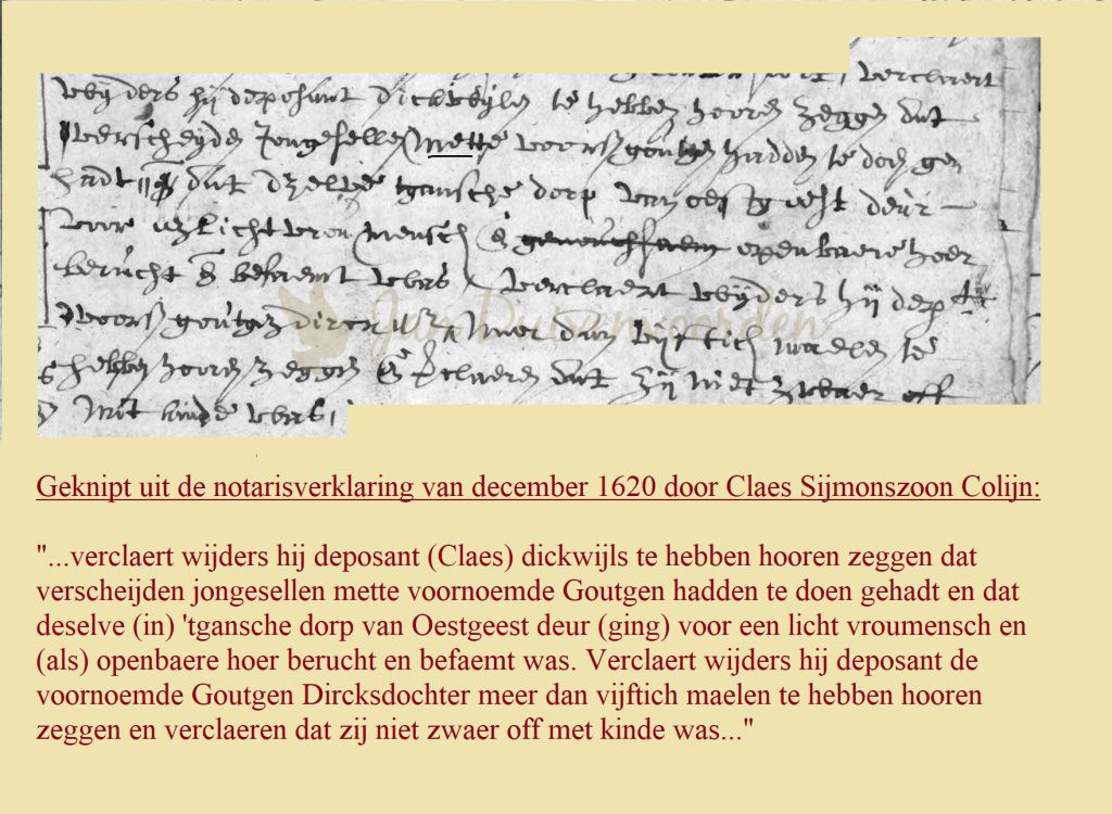 De arme Goutgen ontkent aanvankelijk dat zij zwanger was, haalt bij de geboorte geen vroedvrouw erbij en baart mogelijk mede daardoor een dood kindje. Zelfs het dode kindje probeert zij nog te verbergen als de vrouwvrouw alsnog langskomt, door de buren gewaarschuwd wegens het gekerm van Goutgen. Zij verklaart zoals de wet dat vereist op een vraag van de vroedvrouw dat Claes Sijmonszoon Colijn de vader was van het kindje. Die laats zich dat niet aanwrijven en roept menige getuige op om vooral aan te tonen dat Goutgen een losbandige jongedame was die dit allemaal over zichzelf afgeroepen had.