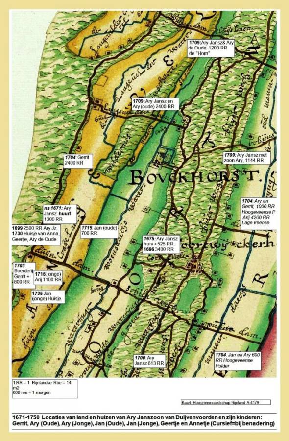 In dezelfde periode waarin Arij onroerend goed aankoopt zijn ook de kinderen bezig met het opbouwen van onroerend goed bezit. De kaart laat zien waar de eerste generaties Duijvenvoorden woning of landerijen hadden. De kinderen van Arij Janszoon vestigen zich vooral aan duin, rondom de Duindamse Slag.