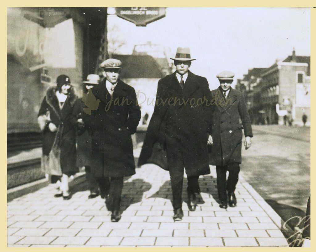 Wie zijn jeugdvrienden waren, we kunnen het helaas niet meer vragen. De foto met gleufhoed en Al Capone uitstraling op de Stationsweg in Leiden doet vermoeden dat hij in zijn jeugd wel meer van de wereld gezien moet hebben dan het slaperige bollendorp. Een Don Juan schuilde echter niet in hem want hij trouwde pas op zijn 37e! Hoewel er geruchten overgeleverd zijn dat een boerendochter uit het Langeveld “op hem uit was”. Geruchten zijn geen feiten, dus we parkeren die aan de zijlijn.