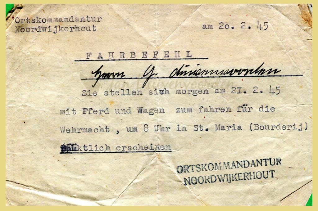 Maar ook kwamen er opdrachten vanuit het gemeentehuis voor transport voor de Duitsers. Later in de oorlog kwamen die van de Duitse afdelingen zelf. Het niet voldoen aan opdrachten kon consequenties hebben volgens een bewaard gebleven brief van het gemeentebestuur. Het was kiezen tussen kwaden. Gerard Duivenvoorden kon zoals menig Noordwijkerhouter opgepakt worden voor de Arbeitseinsatz in Duitsland. Daar kon je onderuit komen als je kon aantonen onmisbaar te zijn voor het bedrijf. Die uitzonderingspositie kreeg hij maar weigeren van Duitse opdrachten werd daarmee nog minder eenvoudig.